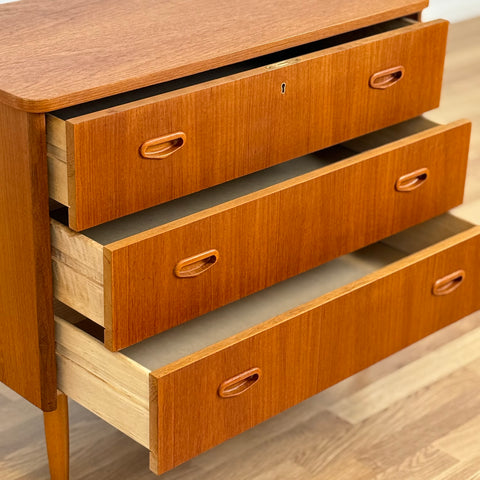 Byrå tillverkad i Sverige på 1950-60-talet. Den är gjord av bokträ på benen och teak på strukturen och ovansidan. Den har noggrant restaurerats av vårt team och har behandlats med ett lager av linolja och hårdvaxolja. Det är en begagnad vara med spår av användning, såsom små märken och repor.