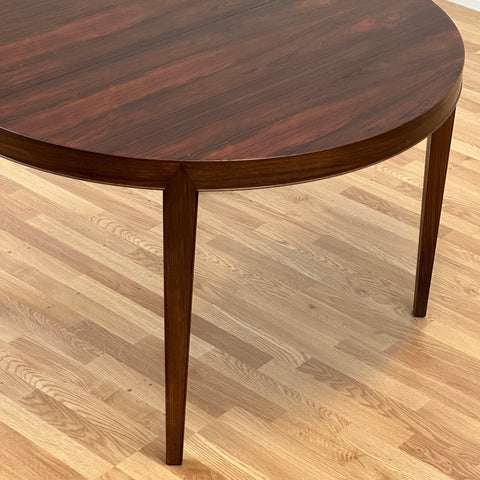 Matbord tillverkat i Danmark på 1950-60-talet av Haslev Mobelsnedkeri. Bordet är designat av Severin Hansen. Det är gjort av massivt trä i konstruktionen och santos rosenträfanér på ovansidan. Bordet har två iläggsskivor som gör att det kan bli 100 cm större. Bordet har noggrant restaurerats av vårt team och har behandlats med ett lager av linolja och hårdvaxolja. Bordet är ett begagnat föremål med användningsspår, såsom små märken och repor. Om du har fler frågor kan du kontakta oss via info@beyovintage.se.