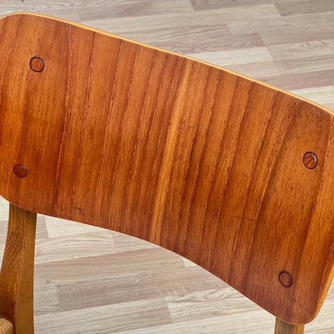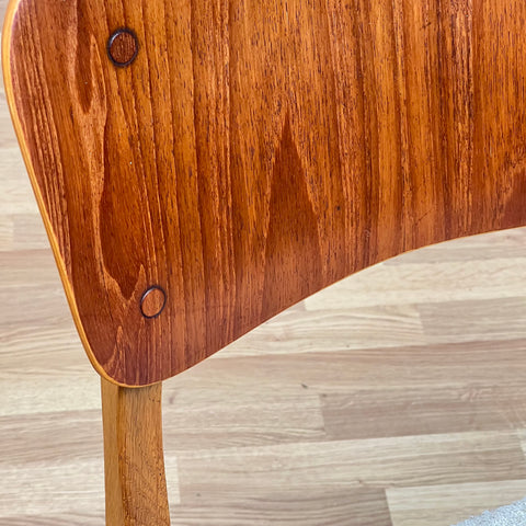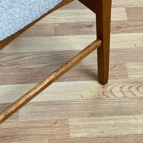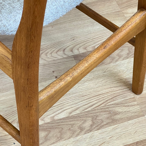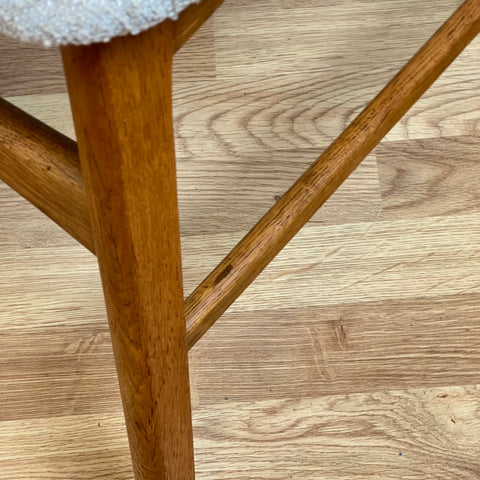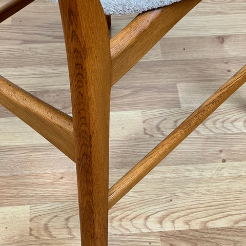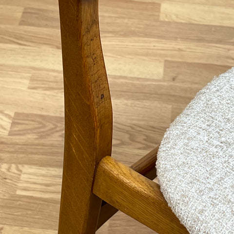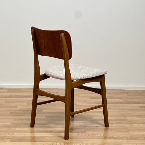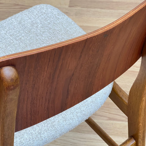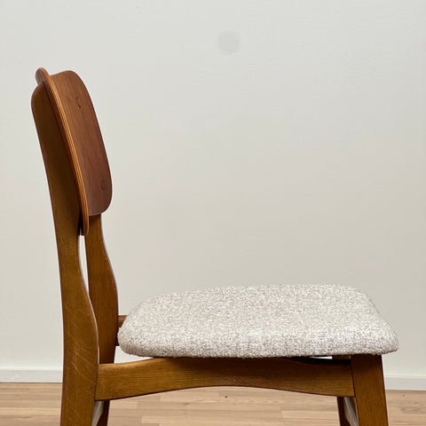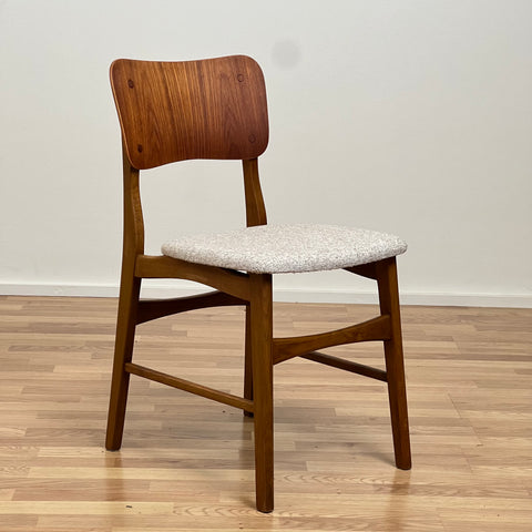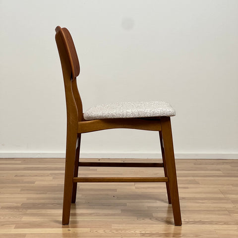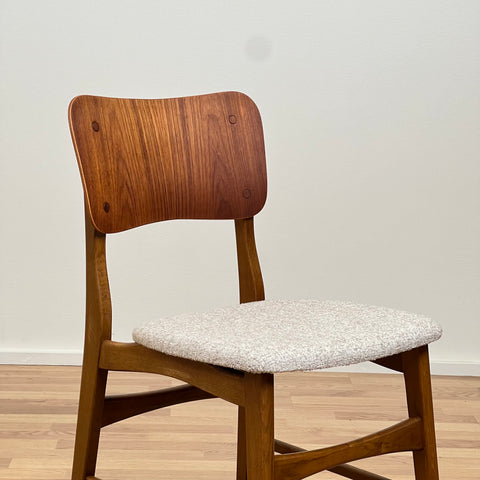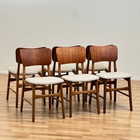 Set om 6 stolar tillverkade i Danmark på 1950-60-talet. Stolarna är gjorda av teakträ i strukturen och teakträ i ryggstödet. Stolarna har blivit helt renoverade och omklädda av vårt team. Stoppningen har bytts ut och vi har valt ett beige tyg för dessa delar. De säljs som ett set om 6 och priset är per styck, för att se tillgänglighet av fler av samma stolar vänligen kontakta oss via info@beyovintage.se.